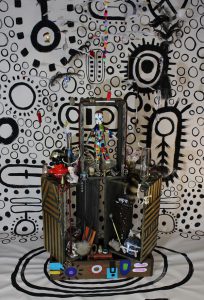 To preside over the altar, Wilks created a wish deity, a playfully repurposed baby doll —nonreligious, ageless, genderless, raceless — as a colorful, welcoming figure. Above, he hung 200 wish catchers, stringing feathers (some painted, some gilded), found items and the rolled-up wishes on threads to create a mesmerizing layer of twirling, shifting manifestation.