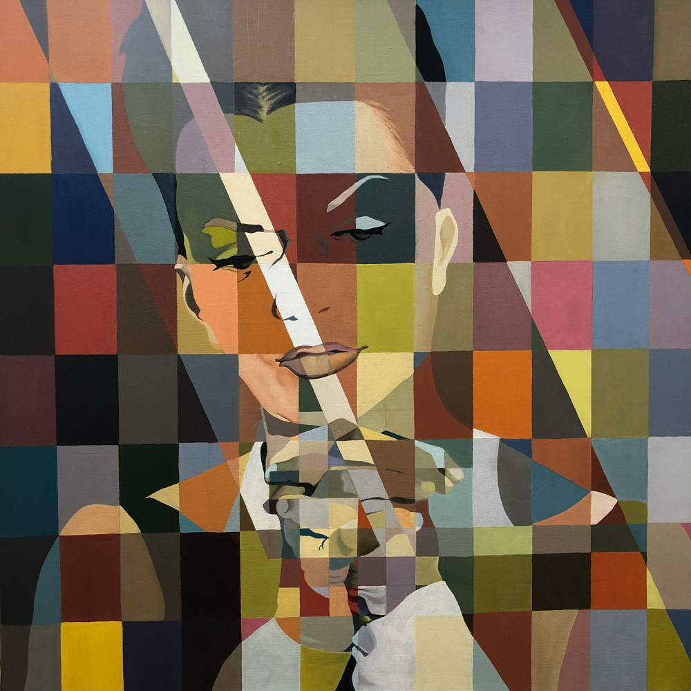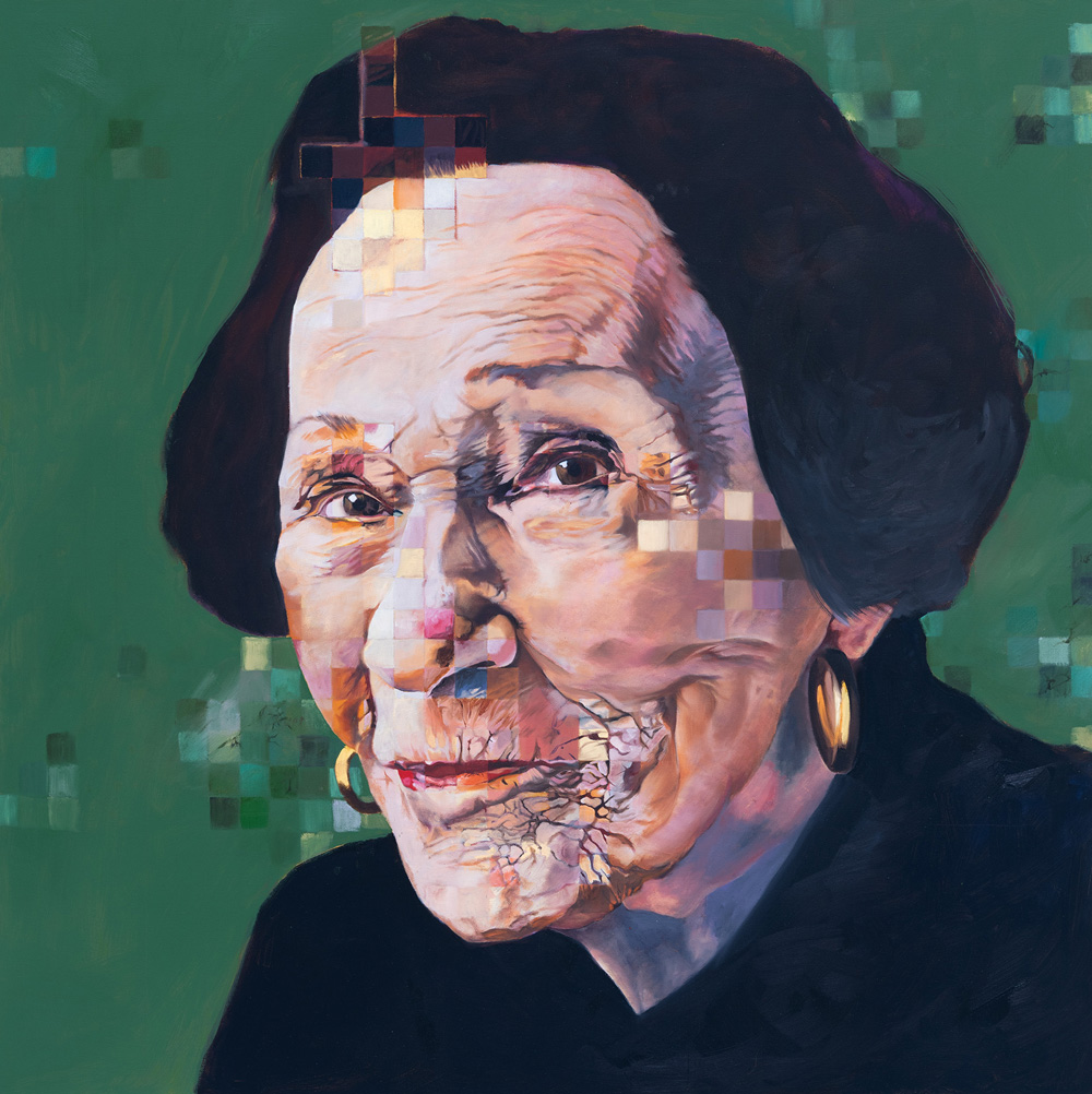 In other portraits, an aggressive grid disrupts the sitter’s face, or as in the portrait of Brazilian artist Lygia Clark, completely dominates the painting as the portrait becomes a shadowy secondary element. Similarly, the grid in Mokoto Fujishiro Huthwaite’s portrait comprises the entire background, invading the sitter’s body and face, as if she is pixelating.