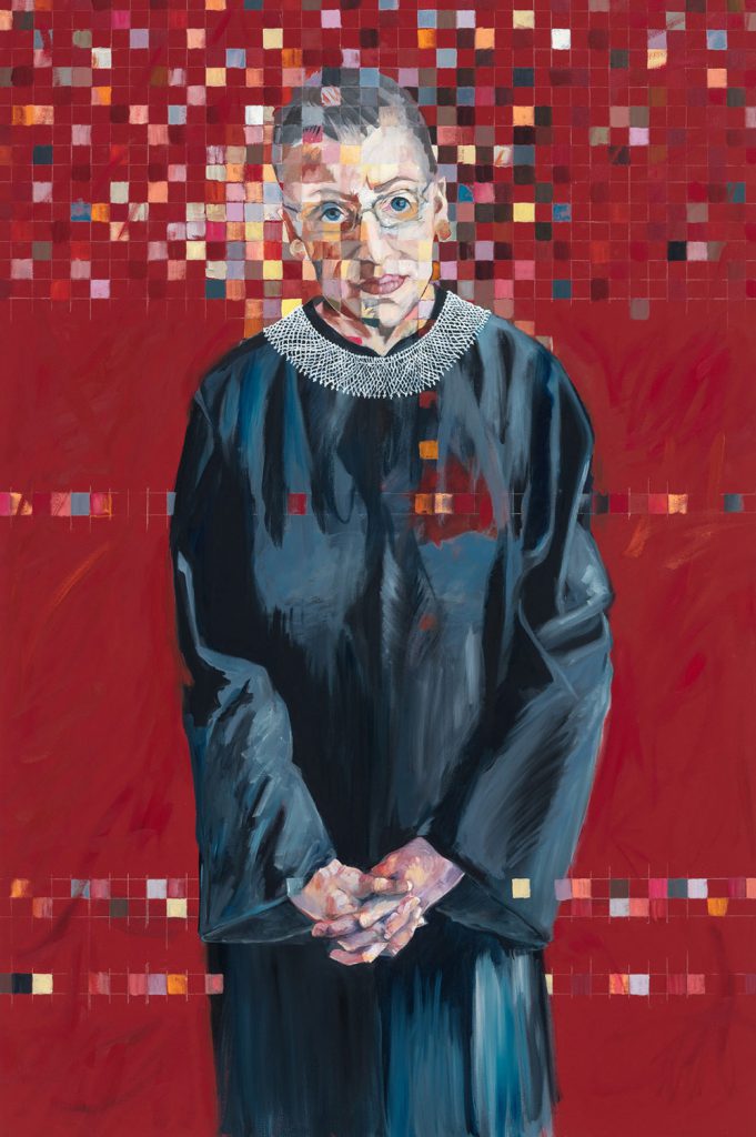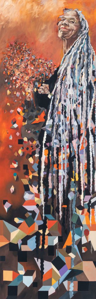 In relatively thin layers of paint, Streeper portrays the women mostly from the waist or shoulders up, except for RBG and Ruth Wilson Gilmore, abolitionist, prison scholar and professor. Gilmore’s fantastical full-length portrait is the outlier; her grey dreadlocks cascade over her shoulders and envelop her body. Here, the ubiquitous grid devolves into a mass of myriad geometric shapes, suggesting that she exists in a complex conceptual and literal space.