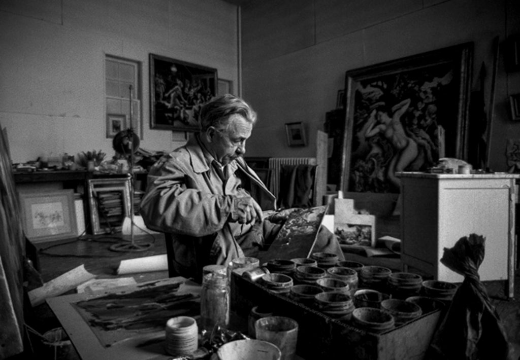 Michael Mardikes had had a brief career as a commercial photographer before going on to work in management at the Ford Motor Company and later at UMKC. He made the acquaintance of Benton through Eugene Pyle, a former student of Benton’s and Mardikes’ photography instructor at the Art Institute. In 1955, Benton asked Mardikes to photograph him; Mardikes visited Benton 35 to 40 times, over a period of a few months in late 1955 and early 1956. Sitton told Vedros that not only was Mardikes’ amount of access incredible, but that the resulting body of work was unmatched.