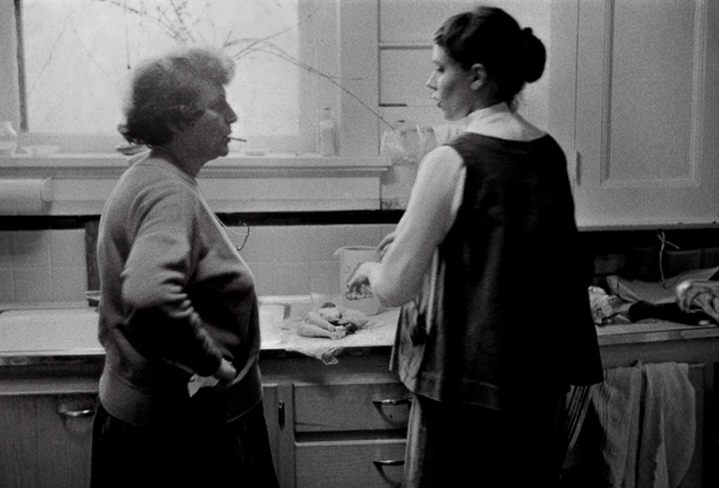 This group of black and white photos not only documents the artist’s working process but also reveals other aspects of his daily life: one memorable image reveals Rita Benton massaging her husband’s stiff shoulders after a long day in his studio. Other images show members of the River Club board visiting Benton’s studio to check on the progress of the mural. One charming image captures a candid moment of Rita Benton and Myrt Mardikes as they collaborated in the Benton kitchen making chicken kapama for their husbands.