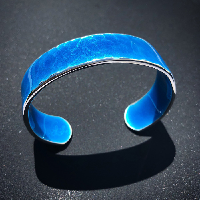Who wouldn’t want a kiln-fired enamel cuff in luminous hues? The custom-fitted bracelets are the specialty of Dallas-based artist Lindsey Owen Leath, who learned jewelry design and silversmithing at the University of Kansas before founding Lindsey Owen Custom Jewelry and embarking on a career as an independent enamelist/jewelry maker. “I’ve homed in on achieving pure opaque and transparent colors,” Leath says, in “color schemes with stormy, oceanic depth paired with galactic bursts of warm, bright nebula-like formations in glossy and matte textures.” She forms each copper or fine silver piece by hand, using metal hand saws and hammers, then sifts vitreous enamel color over each piece before kiln firing it. Leith guarantees a comfortable fit and offers new clients a personal wrist fitting kit with no charge for shipping. To purchase, contact [email protected] or visit