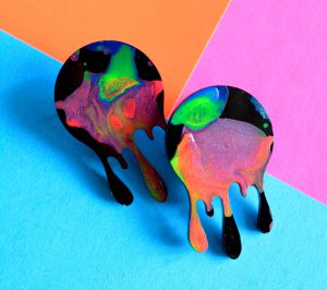 Prices: Zipper Clutch, $25; Mini Drip Acrylic and Enamel Earrings, $18