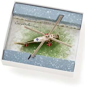 The White House Historical Association has released another stunning Official White House Christmas Ornament, a tradition that dates to 1981. The 2019 ornament, a gold-trimmed helicopter, honors President Dwight D. Eisenhower, the first president to fly in a helicopter while in office. Throughout his presidency, Eisenhower used several crafts and crews for short-distance travel, so the ornament represents the style of helicopter used rather than a specific craft. One side of the ornament displays a presidential seal; the other has his five-star ranking, earned during WWII. The exquisitely designed ornament is housed in a box adorned with an illustration of the south lawn, where Eisenhower’s helicopters would land.