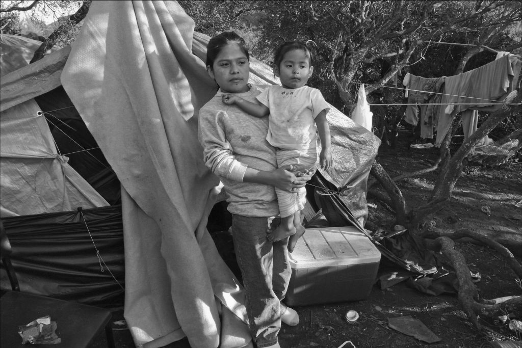 Justo después de llegar de México, una trabajadora agrícola mixteca vive con su hijo en una tienda de campaña en la ladera en Del Mar.