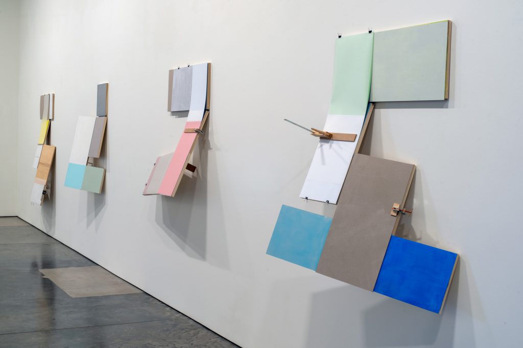 In the largest gallery Woodfill returns to the painted square as a found studio object and the primary building block of 17 modular assemblage works enhanced by elements of sculptural collage. The “Semaphore” series appears to lift, peel or even buck off the wall. The matte monochromatic panels actively resist hanging parallel, even when layered over, clipped and clamped by external hardware. Furthermore, the painted squares are hinged to other squares; they can bend, fold or reposition as conditions change. Their inherent restlessness can be perceived in the strange shadows cast by the polygonal forms.