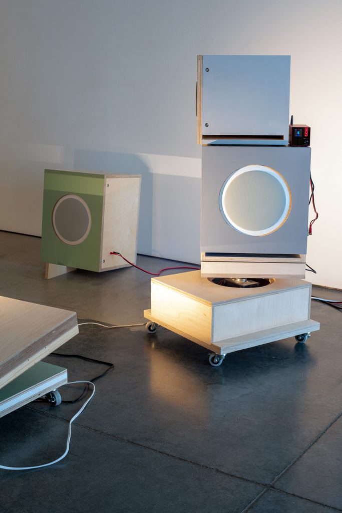 Sound Installation view, custom loudspeakers, hi-fi equipment, turntable, lights and hardware (from the artist)