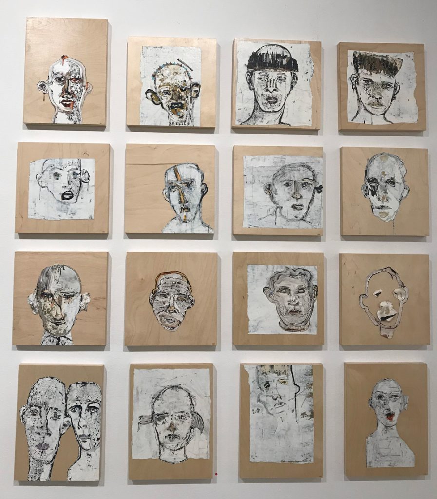 One wall of 16 expressionistic male portraits (wall 7), on a mottled white background with heads outlined in black and hung in a grid, could be the basis for an entire show. The faces, inscrutable and intense, radiate an inner force that is palpable. They are in a league with such past gestural masters as Chaim Soutine, or Giacometti.