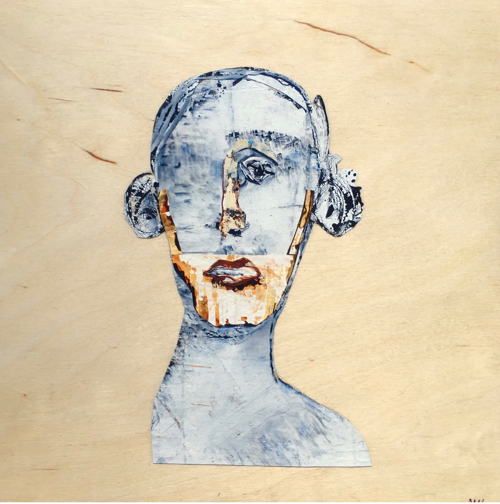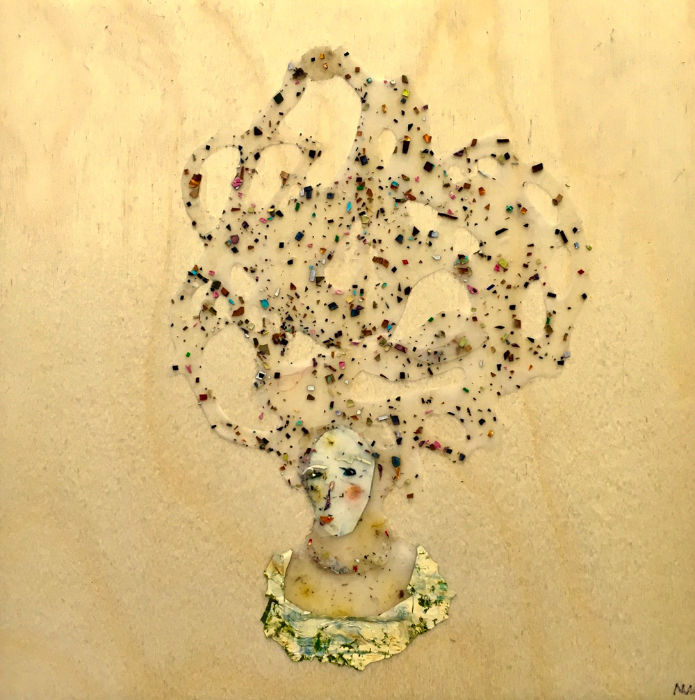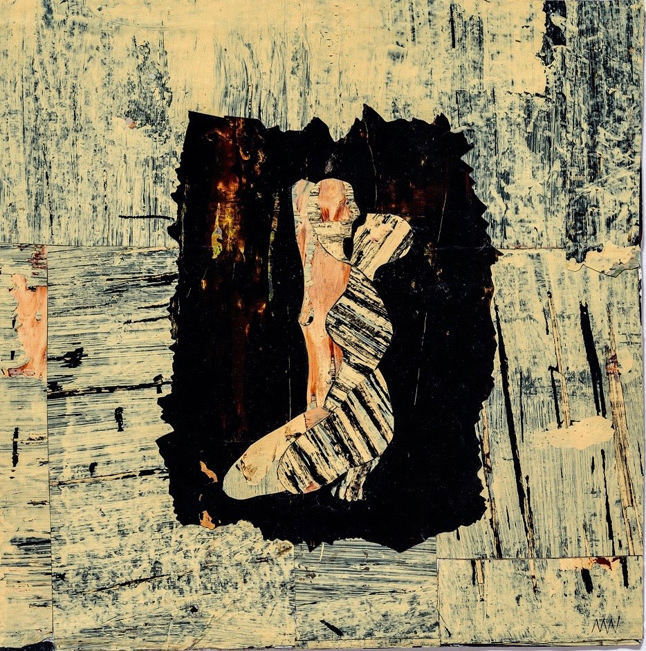The title of the show refers to the scale of Westervelt’s works — his pieces are sized at 5 by 7″, 10 by 10″ and 9 by 12” each. They may be small, but they are mighty. On some, the surfaces are completely covered with a variety of markings. On others, a figure or portrait resides on an elegantly sanded and varnished block of wood. Westervelt combines painting, drawing, collage and assemblage, for the most part using dried paint chips, paint skins, debris and glue to create a myriad of images that range from the grotesque to the bizarrely beautiful, with emotions that can be anguished or ethereal or slapstick.