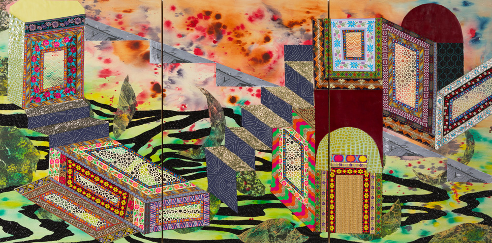 Natalia Nakazawa’s work “History has failed us…but no matter” (2019) remembers the imprisonment of Japanese Americans in internment camps during World War II. The large-scale work from the “Visual Heteroglossia” series mixes watercolors, textiles, jewels, and photographic transfers. A zine featured in the back of the gallery shares that this series “gathers material from the past, present, and future.” As the title of the piece suggests, with its use of ellipsis, the work makes a statement, but in a refractive way, to paraphrase Mikhail Bakhtin, who coined the term heteroglossia.